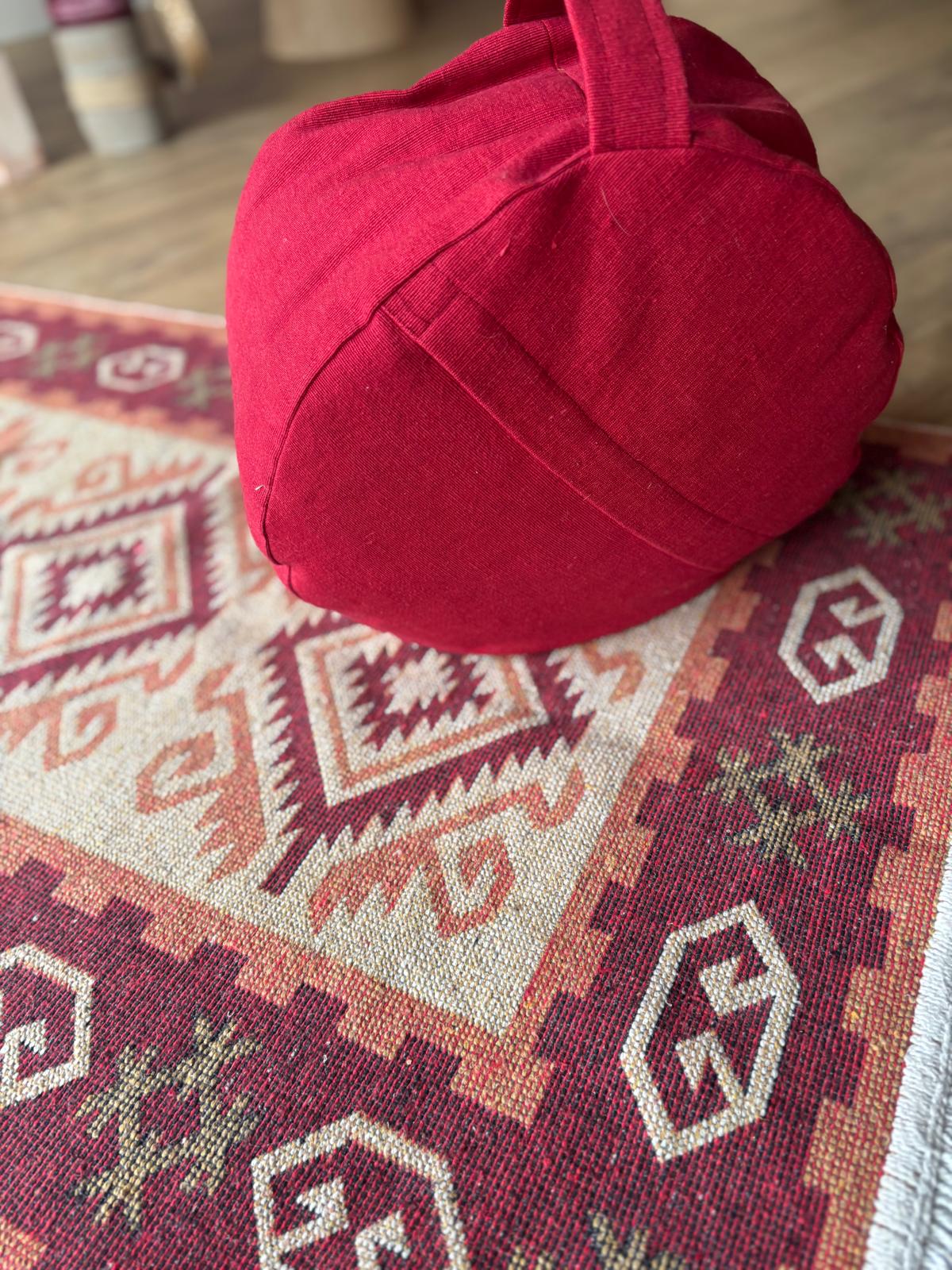Dit rode meditatiekussen is handgemaakt door ons team met liefde. We kopen geen nieuwe stoffen in, maar gebruiken unieke vondsten en tweedehands materiaal. Wil jij zo’n uniek kussen in jouw meditatieplek in huis?